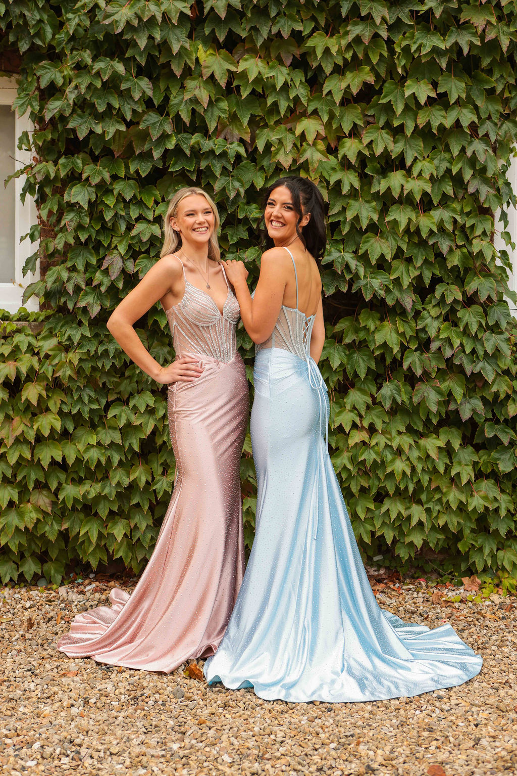 Full diamond bling corset bodice with lace back. fitted jersey skirt with rhinestone detailingÂ